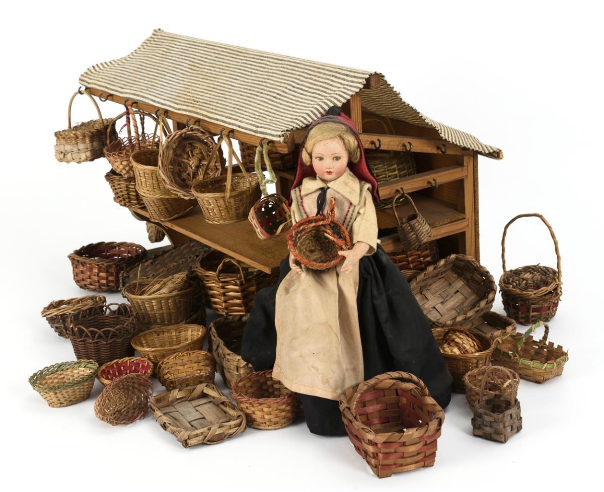 Richly furnished stand with various baskets. In addition mass doll in traditional costume as a saleswoman. Traces of age, small defects.