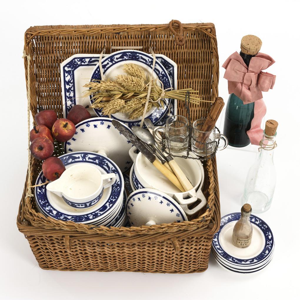 Richly decorated picnic basket with ceramic dishes for 6 personalities, 3 bottles, 2 handled glasses, some cutlery, papier-mâché apples etc. Few small defects.