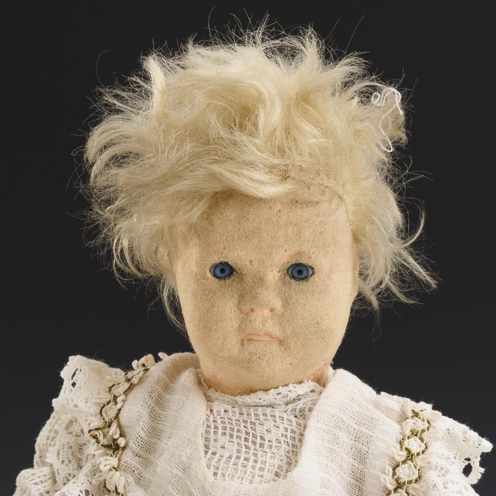 Turnable head, inlaid blue glass eyes, mohair wig. Body with movable limbs. White dress. Defects, traces of eating.