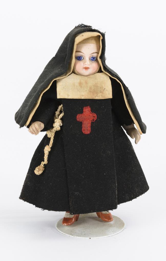 Small umzäunter garden (Hortus Conclusus), inscribed: "Waldwacht" with cross, prayer bench and tree trunk. In addition miniature Bible, 3 rosaries, hare, tree and whole bisque doll with blue glass eyes, in black Benedictine costume. Garden rusty, at the doll no defects visible.