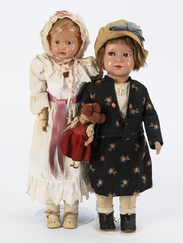 Character girl with crank head, blue sleeping prankster eyes, glued blond mohair wig and black costume with floral pattern. Accompanied by small traditional turtle doll / Early chest-headed girl with blue glass eyes, modelled hair and white dress with bonnet. Both with oilcloth body and jointed arms. 1x small defects at corners of mouth, 1x ears with glue residue, faces minimally rubbed.