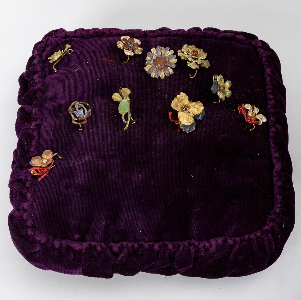 Doll cabinet walnut, door with faceted mirror glass, inside 1 drawer, lock jammed. Chest shaped travel case with 2 handles and lock. In it violet velvet cushion with 10 flower brooches. / Green botanizing drum with embossed front image (L 18,5 cm). Signs of age.