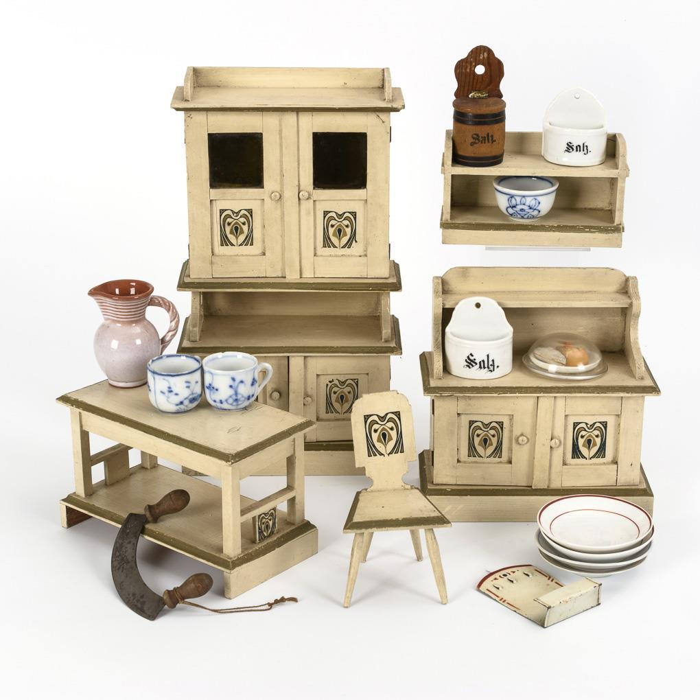 5 pieces of furniture with stencilled ornaments: cabinet, sideboard, table, shelf and chair. Plus 7 pieces of accessories, mostly porcelain. Marks of age, played with.