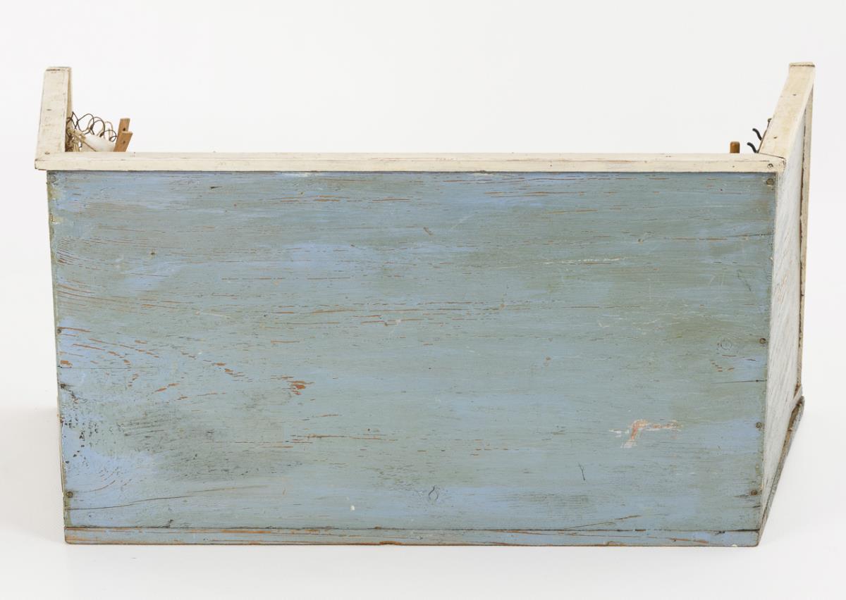 Wood, painted light blue outside, old wallpapered inside. 23 x 49 x 25 cm.