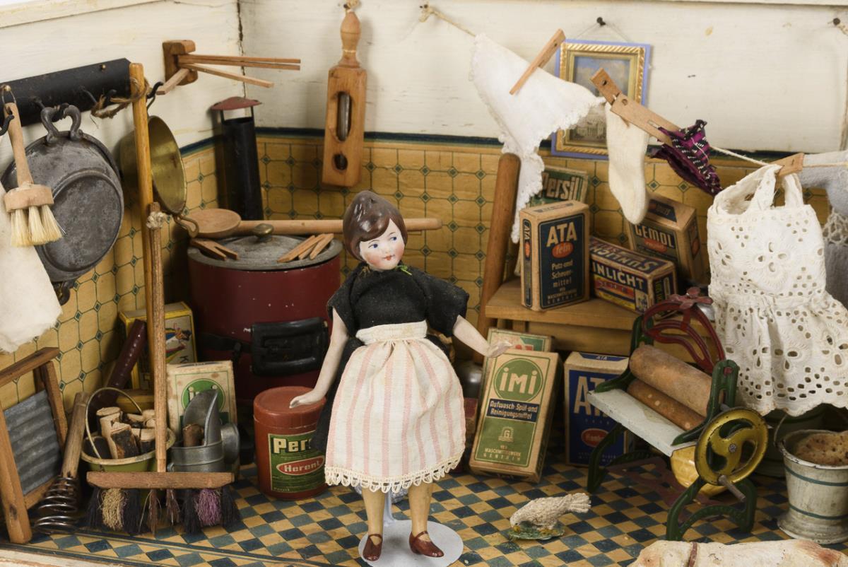Trapezoidal 1-room case, furnished as a laundry: Washing kettle, mangle, iron, clothesline with linen and other accessories. In addition 1 whole bisque doll with apron. Played with, traces of age.