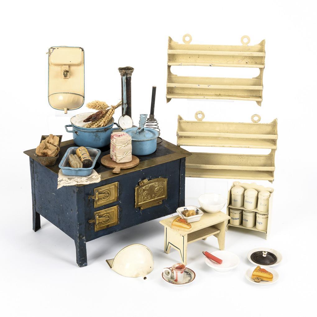 Stove with 3 cooking zones and 3 oven doors of embossed brass sheet. Plus 4 pieces of blue enamelled cookware, 2 white painted wall shelves, 1 wall shelf with storage boxes, 2 sinks. In addition white wooden bench and some parts porcelain. Traces of age, lacquer defects.