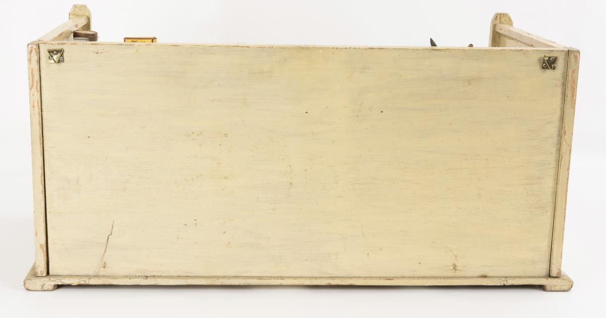Wood, painted creamy white outside, old wallpapered inside. 40 x 83 x 40 cm.