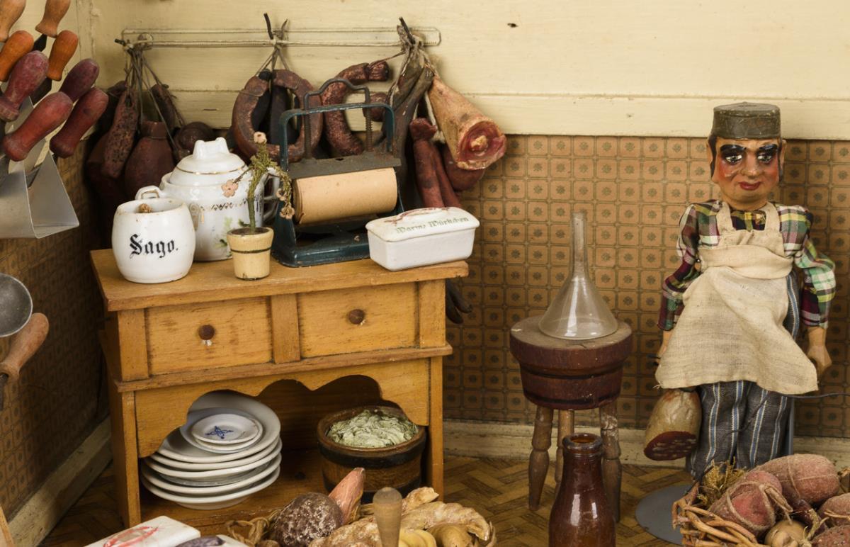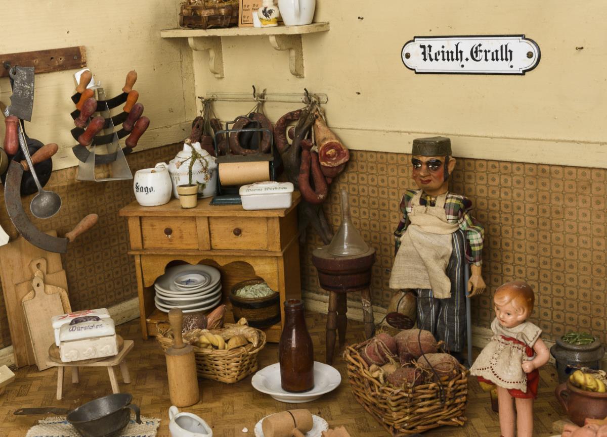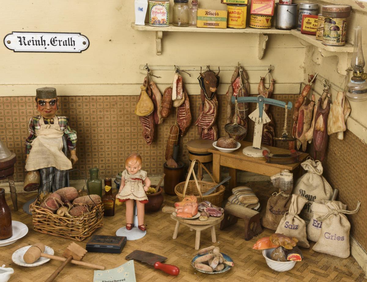 1-room case with wallpaper in tile-look, as butcher's shop "Reinh. Erath" furnished with 2 shelves, table, small cupboard, numerous hams, sausages, pork halves, beef head and accessories. In addition, jointed doll as a master butcher and small mass girl. Played with, traces of age.
