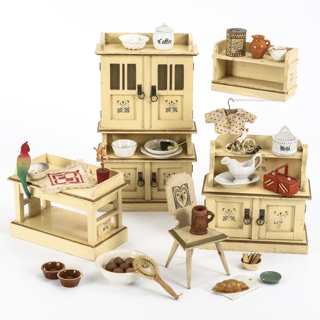 Kitchen buffet, base cabinet, sideboard, small shelf and chair with stencilled art nouveau ornaments. In addition simple table with 1 drawer as well as Konvolut accessories for the doll kitchen. Played, age traces.