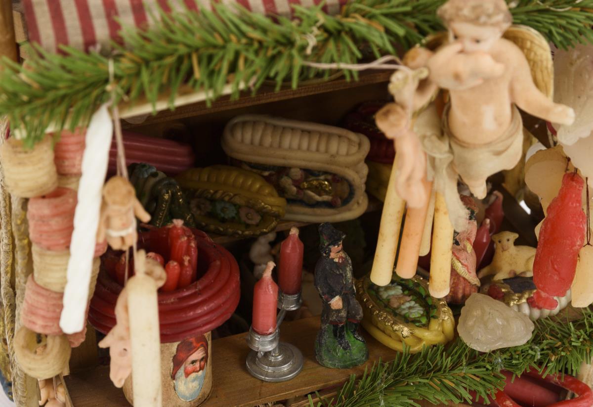 Small market stall with little angels, Christ children, Mary images etc., mostly made of wax. Light signs of age.