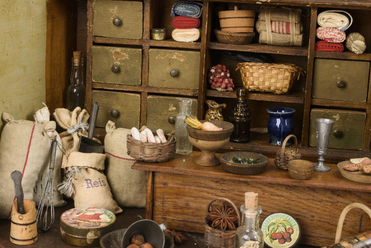 Trapezoidal case with turned front columns and inscribed finial "Colonialwaaren". Fixed shop fitting with 10 drawers, loose counter, numerous accessories including cloth bales, sacks, bottles, jugs etc. Signs of age, paint defects.