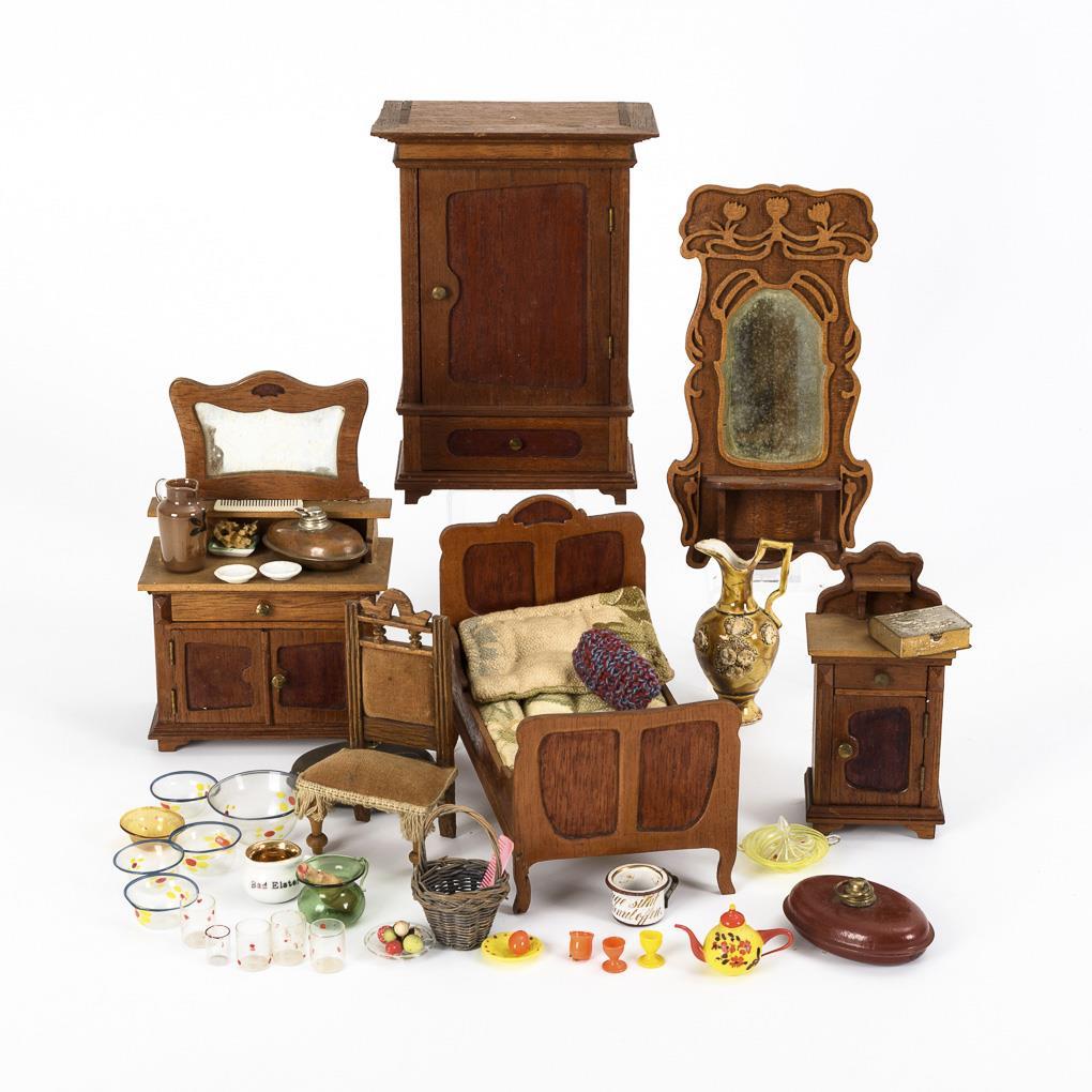 1-door wardrobe, washstand, bed, bedside cabinet, ornate console mirror, 1 chair. In addition, numerous small parts, including chamber pot with saying, dishes made of glass etc. Played with, small defects.