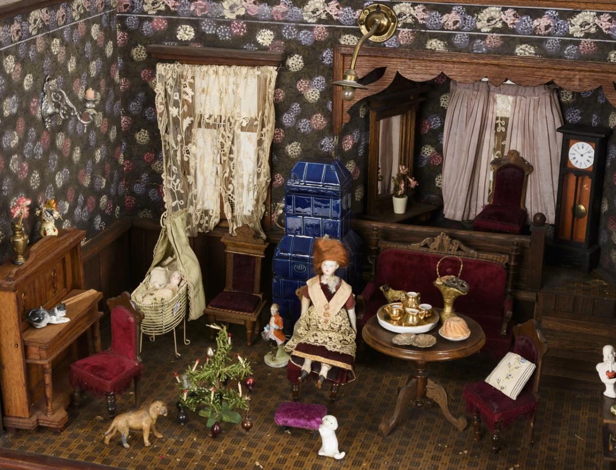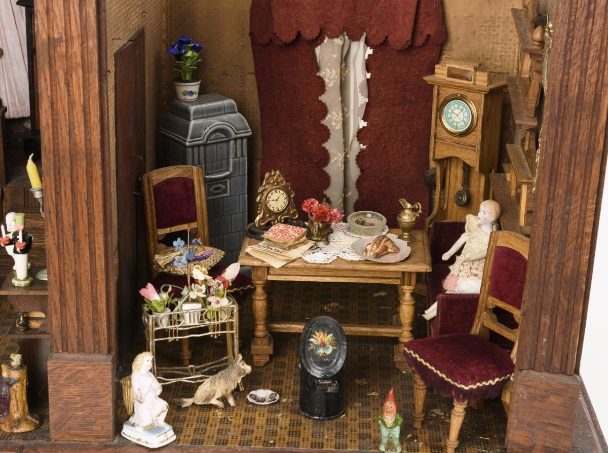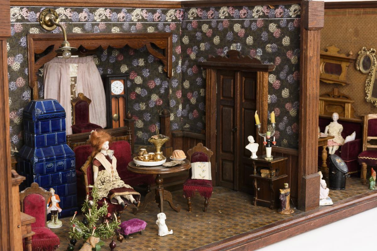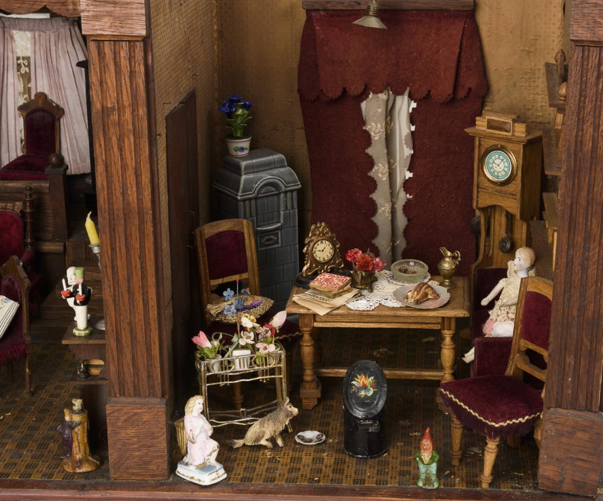 2-room case with 3 glazed windows, curtains and double doors. Furnished as a parlour and dining room with elegant oak furniture, 2 tiled stoves, 2 grandfather clocks, red velvet upholstery and rich accessories. In addition 3 dolls and several dogs. Old electrified, function not tested. Signs of age and small defects.