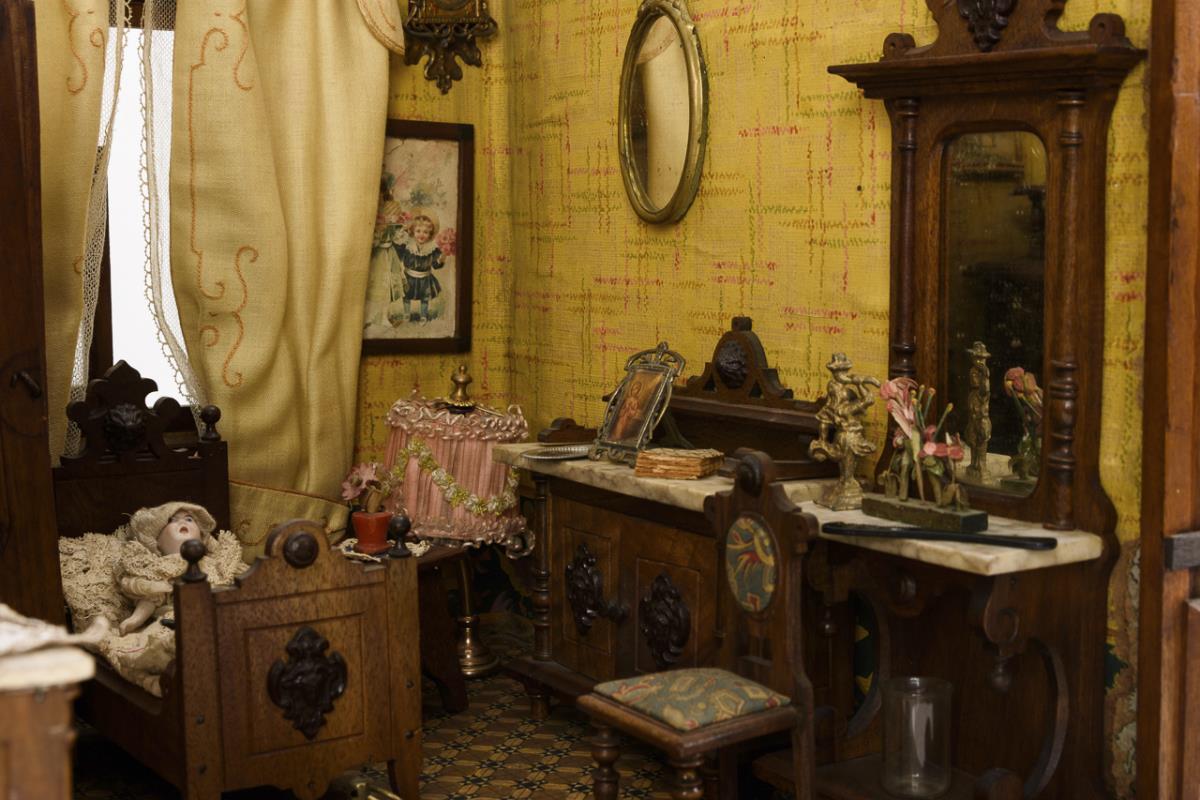2-Raum-Gehäuse with 3 glazed windows, curtains and Zwischentür with gable encrustation. Furnished as a living room and bedroom with Harras-Möbelprogramm, tiled stove, fireplace, piano, clocks, picture frames and numerous accessories. Played, traces of moisture, 1 window defective.