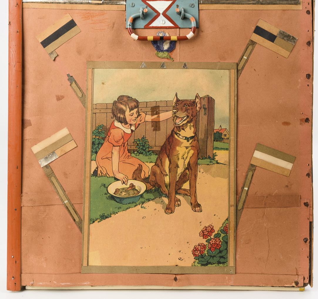 Wood, inside younger wallpapered in Delft style, outside decoratively pasted by children's hands. 41.5 x 71 x 41 cm.