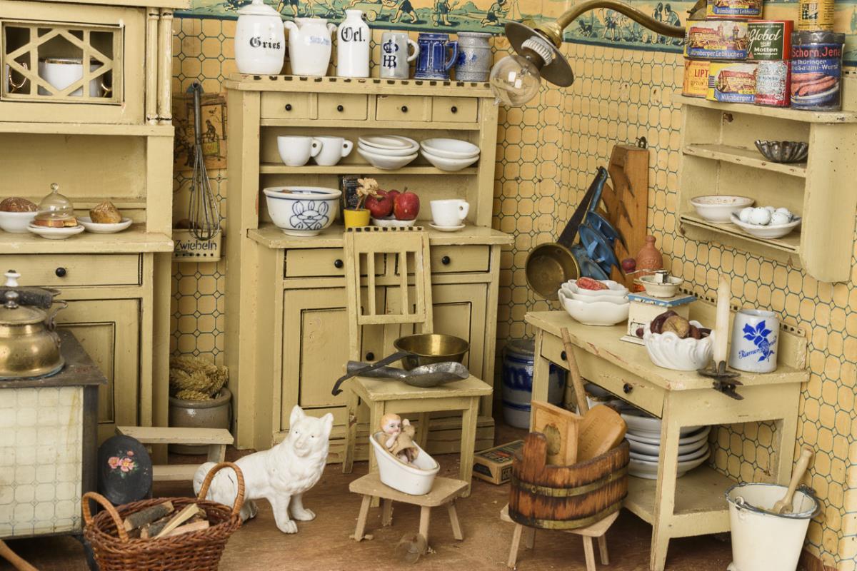 1-room case with 2 side carrying handles. Furnished with tin stove, 7 white furniture and numerous accessories made of porcelain, metal and wood. Played with, signs of age.