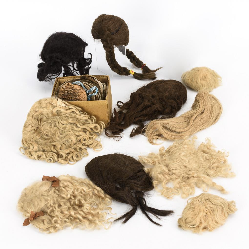 6 blond and 4 dark wigs for medium dolls. In addition Konvolut head covers in different sizes. Altersspuren.