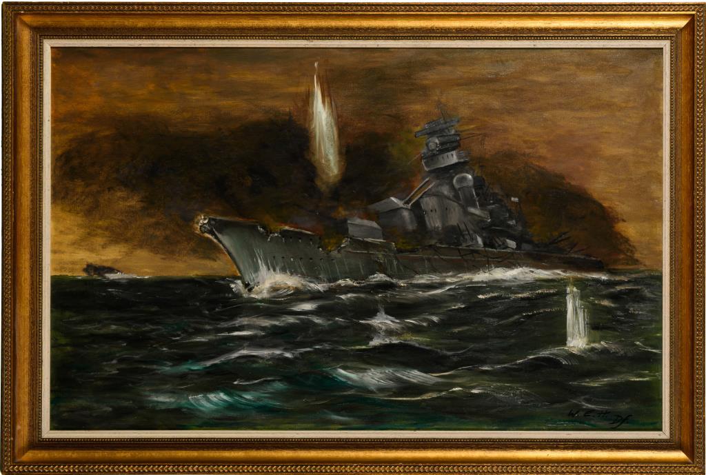 Der stark beschädigte Schlachtkreuzer auf offener See.