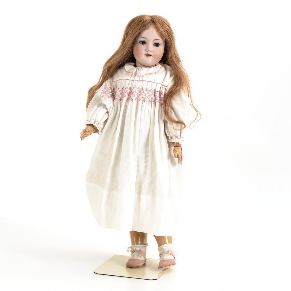 Crank head, blue sleeping eyes, eyelashes, long red synthetic hair wig. 15-piece limb body. White dress, pink shoes. Hair tear at back of head. Right hand repaired, body partially painted over.