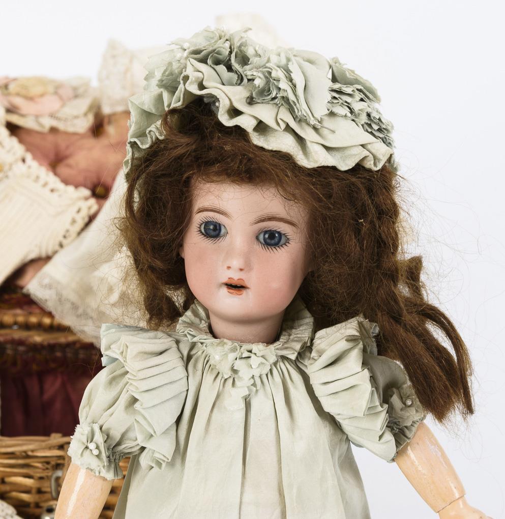 Small doll with probably French crank head (jumeau?), fixed blue eyes, brown mohair wig, 11-piece jointed body and light green dress with hat. In addition basket case with 3 old dresses, hat, brush and comb. Head x-rayed: without defects. Partly slight signs of age.