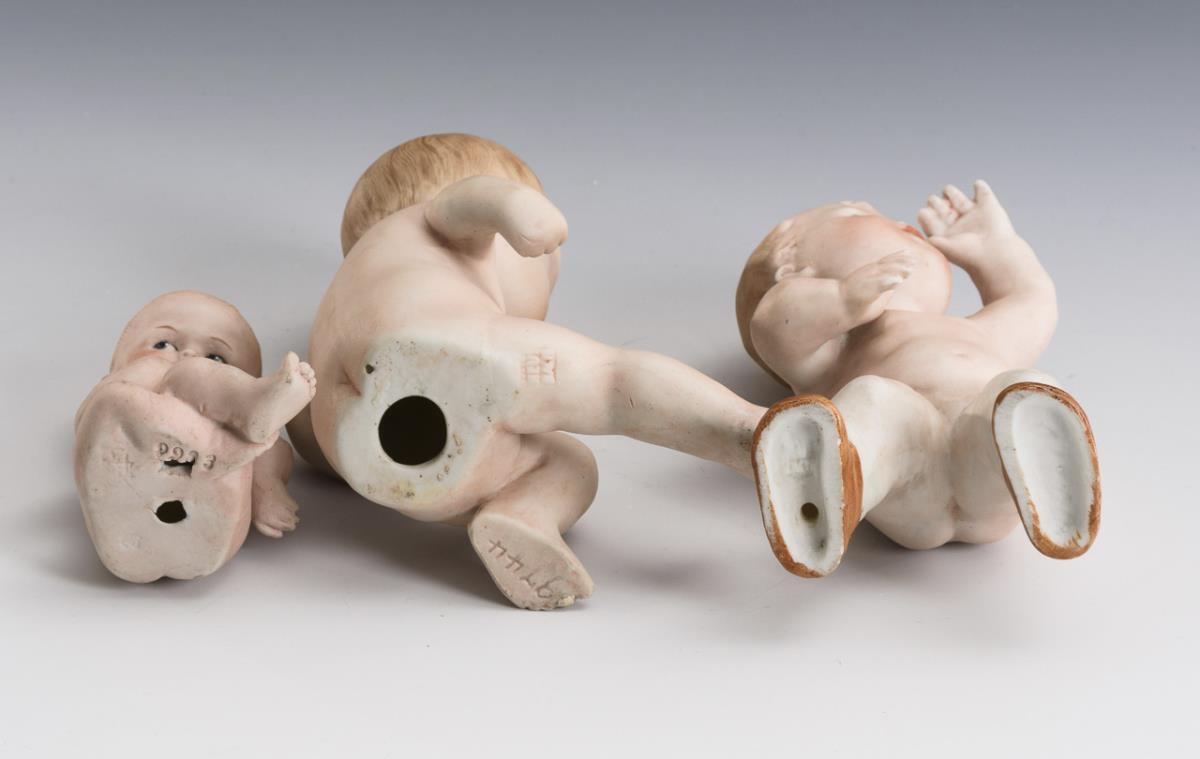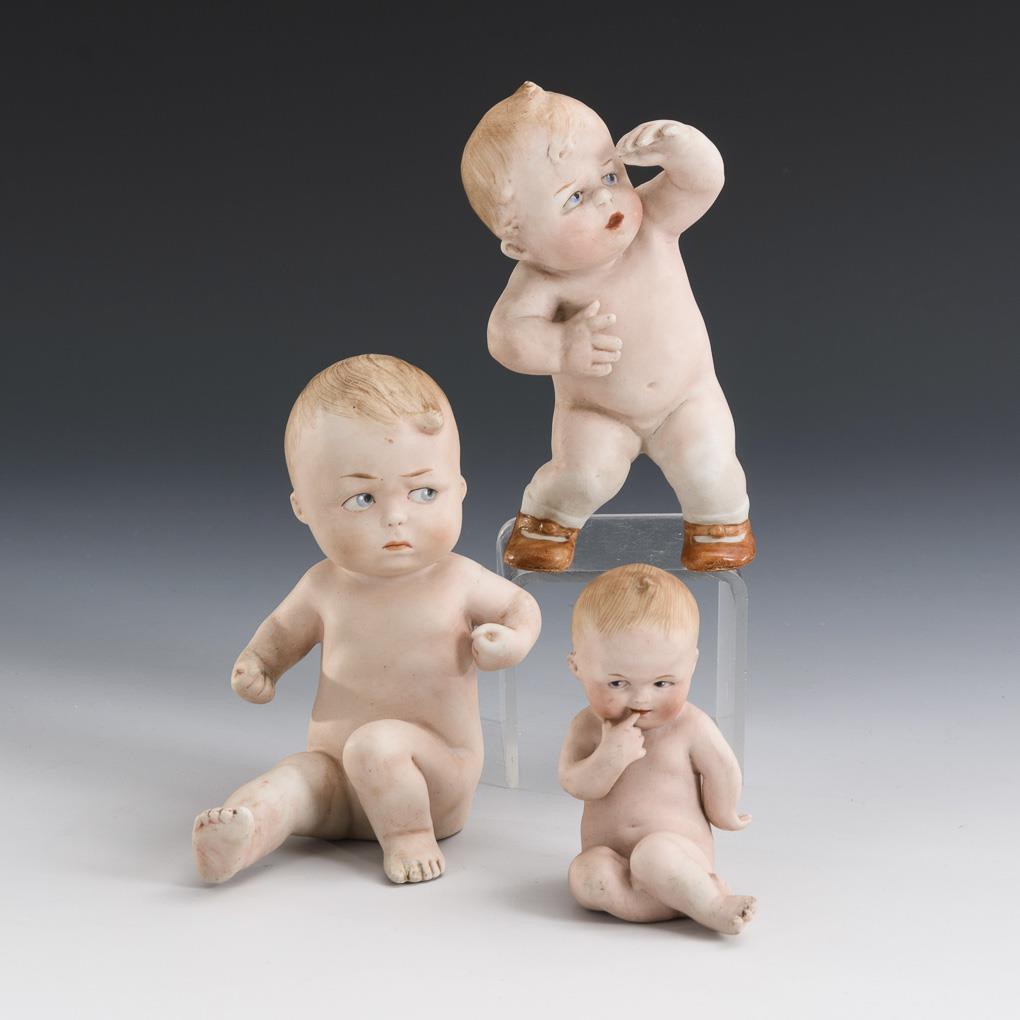 3 nude babies in different positions. 1x with modeled shoes and stockings. 1x with minimal burn crack, 1x minimal hairline crack on bottom, 1x bottom minimally bumped.