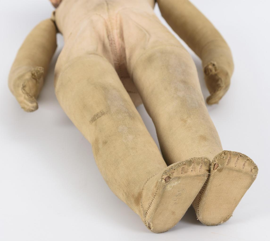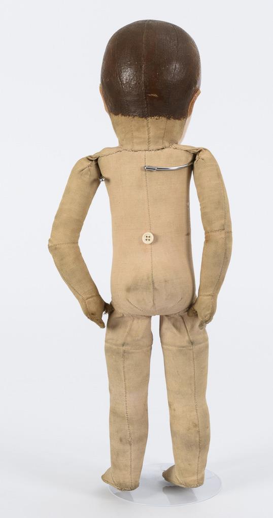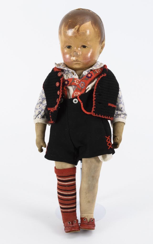 Mask-like painted head with 3 back head stitches, brown eyes, painted hair. Cloth body with rocker limbs and button on back (ribbon missing). Black clothing in traditional costume style, 1 ringed stocking. Head with retouching and paint defects, traces of play on body, with small defects.