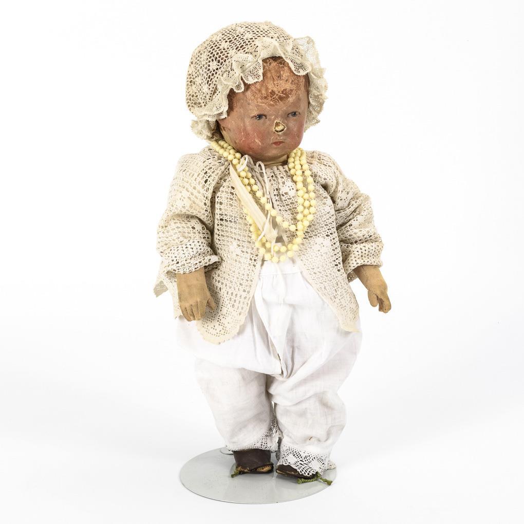 Solidly sewn head with 3 back of head seams and mask-like face painting. Body with 8 seams, rocker arms, legs with disc joints and 5 seams, wide hips, thumbs sewn on individually. White clothing, lace bonnet, brown shoes. With severe defects.