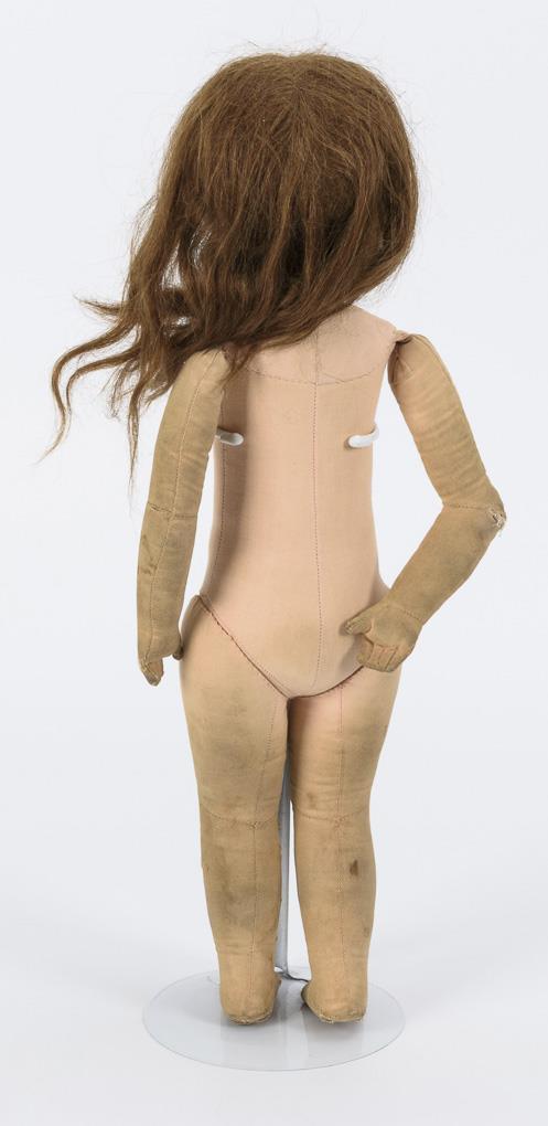 Crank head with 1 back of head seam, painted brown eyes, brown human hair wig. Cloth body with neck bib, rocker arms with elbow seam, legs with disc joints, one seam and additional knee seam. Bright floral print dress, white cardigan, younger supplemented shoes. Played with, face rubbed (no flare under UV), arms and legs soiled, open arm seam on right.