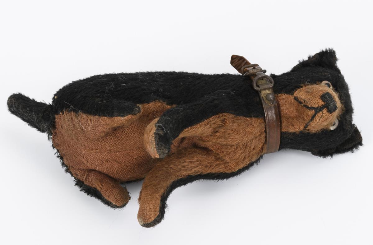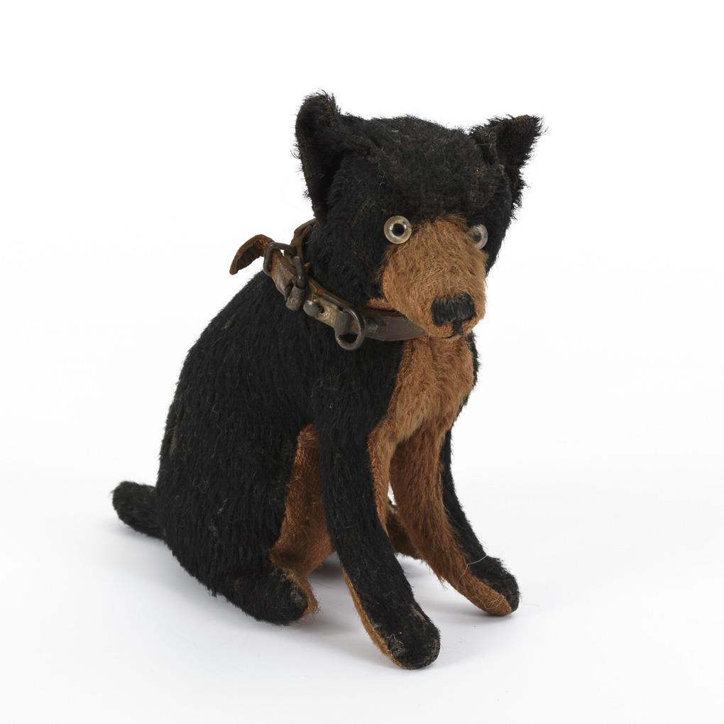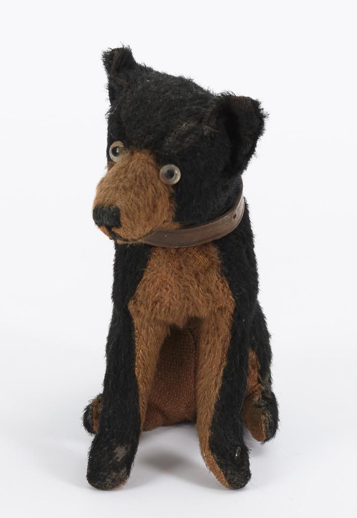 Sitting black and brown dog with light glass eyes and leather collar. Partial flaws in fur, repair to rump.