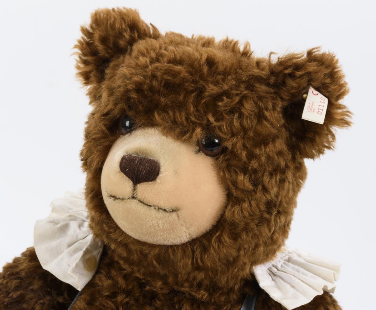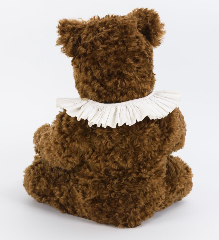 Sitting, dark brown bear with light nose and curly fur. Turning head, arms with disc joints. Comes with children's drum and white collar. Unplayed, minimal signs of age.