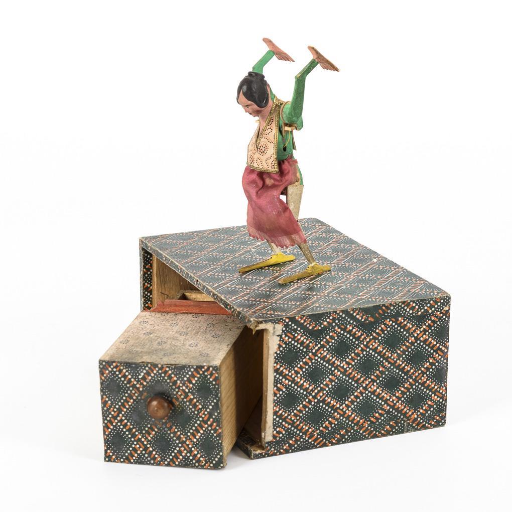 Rare late Biedermeier toy. Paper-covered box without lid, inside small doll with large hands and feet, so-called staircase runner or farter. With original mercury filling and original thread attachment. Age traces.