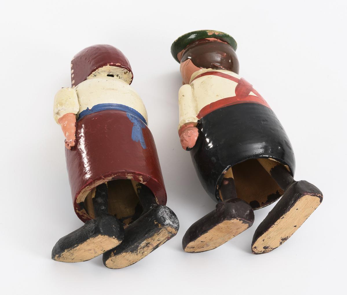 Designed as traditional costume figures, with running mechanism, move forward by tapping. Small paint defects.