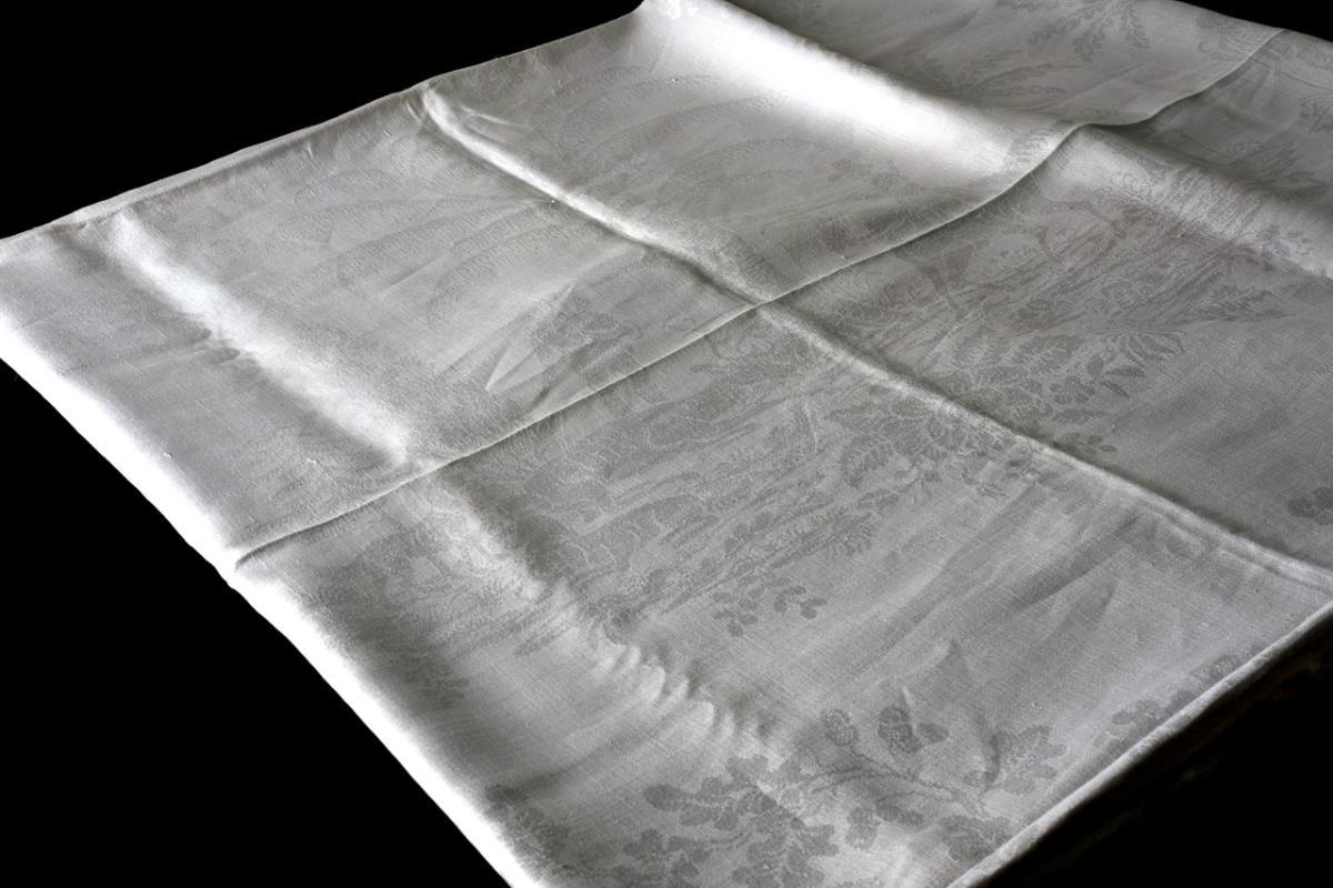 Large cloth with hunter and animal motifs surrounded by oak leaf decoration.