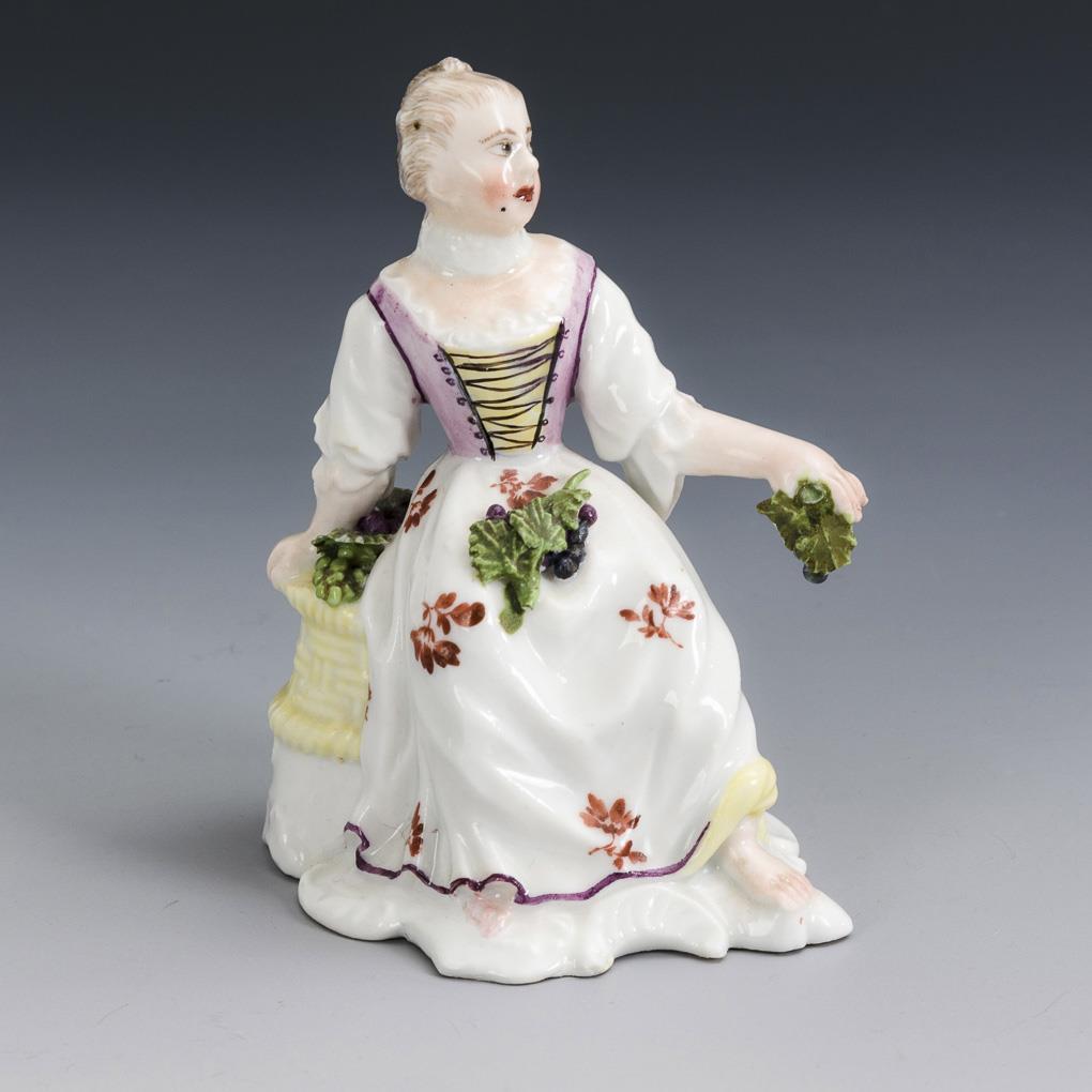 Woman seated on a grape basket with grapes. Leaves bumped, base rim, torso and neck restored.