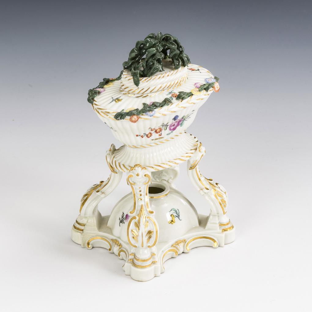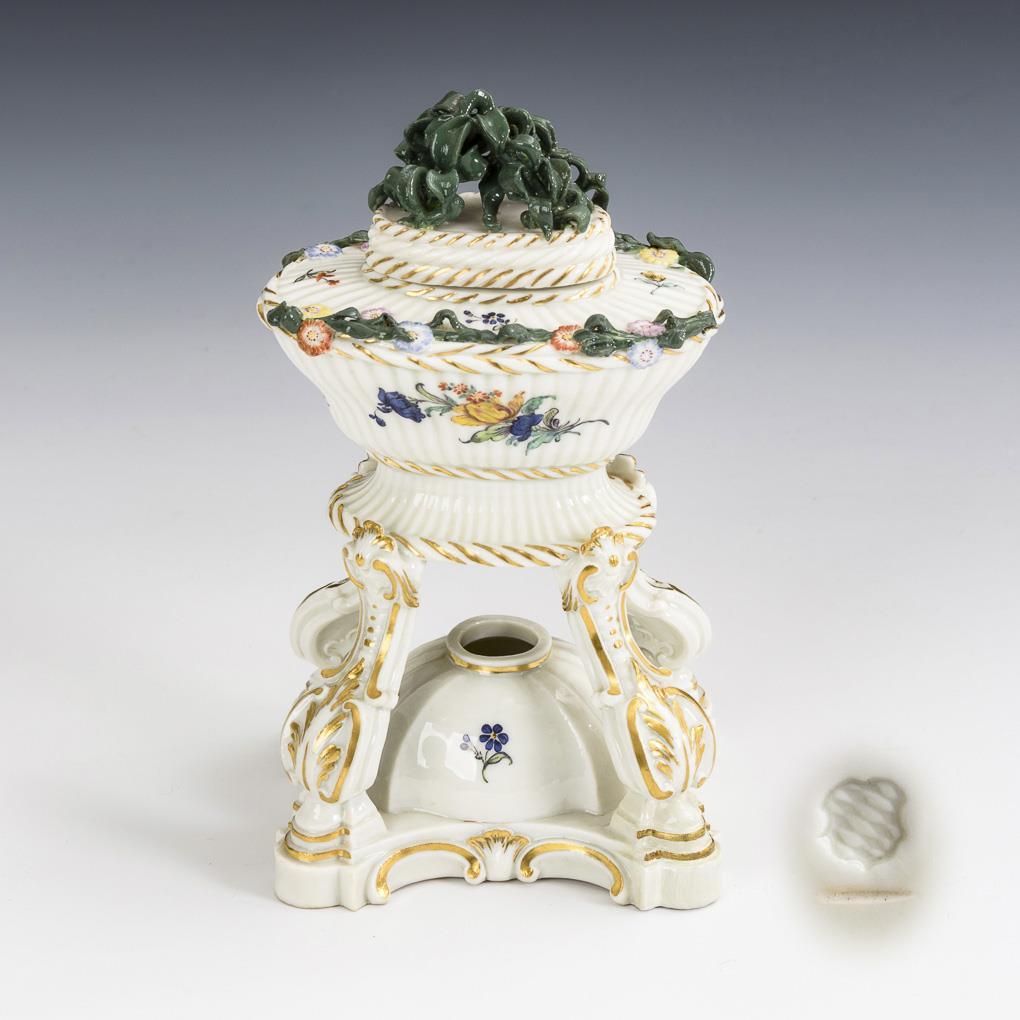 Perfume vessel with ribbed walls and openwork lid with foliate garland finial standing on 4 curved, rocaille-lined feet, a domed burner on the curved plinth. Covered with delicate flower garlands as well as colorfully painted with small scattered flowers. 1 plinth corner, leaf and flower covering restored.