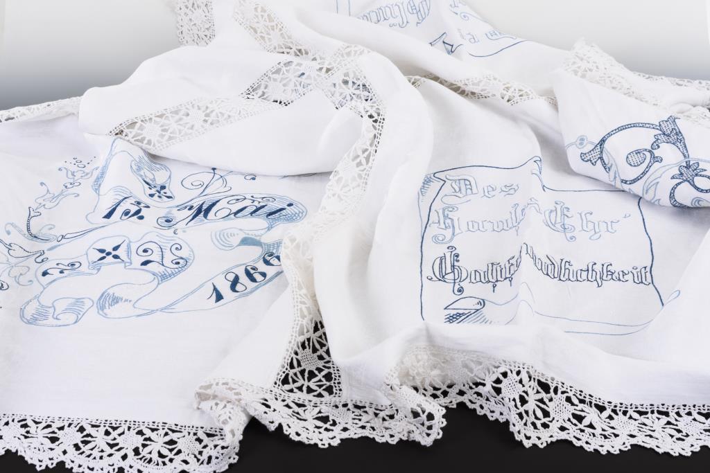 Aus 6 Quadraten und breiten Klöppelspitzen gearbeitete Tischdecke. Blau/weiß bestickt mit großen Monogrammen JM und LM. Datiert 13. Mai 1866/13. Mai 1891, sowie Sprüchen: "Des Hauses Glück/Zufriedenheit", "Des Hauses Ehr/Gastfreundlichkeit".