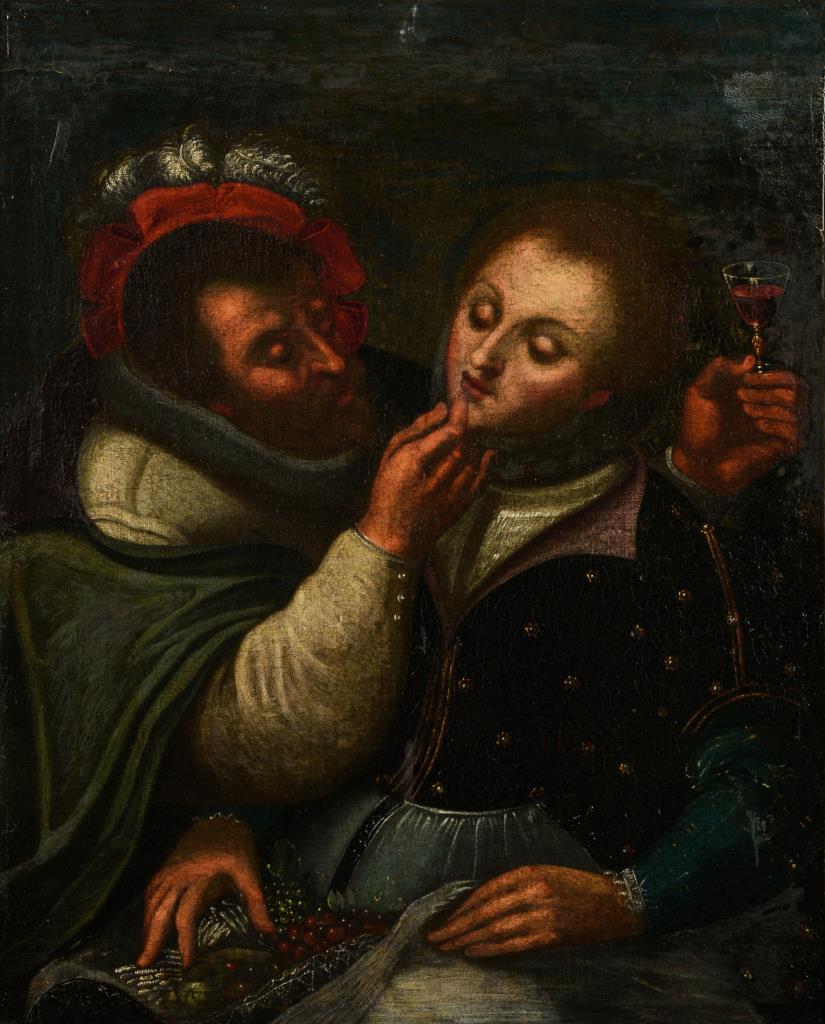 Szene mit Edelmann, der eine junge Frau den Wein von seinem Finger kosten lässt. Leinwand doubliert.