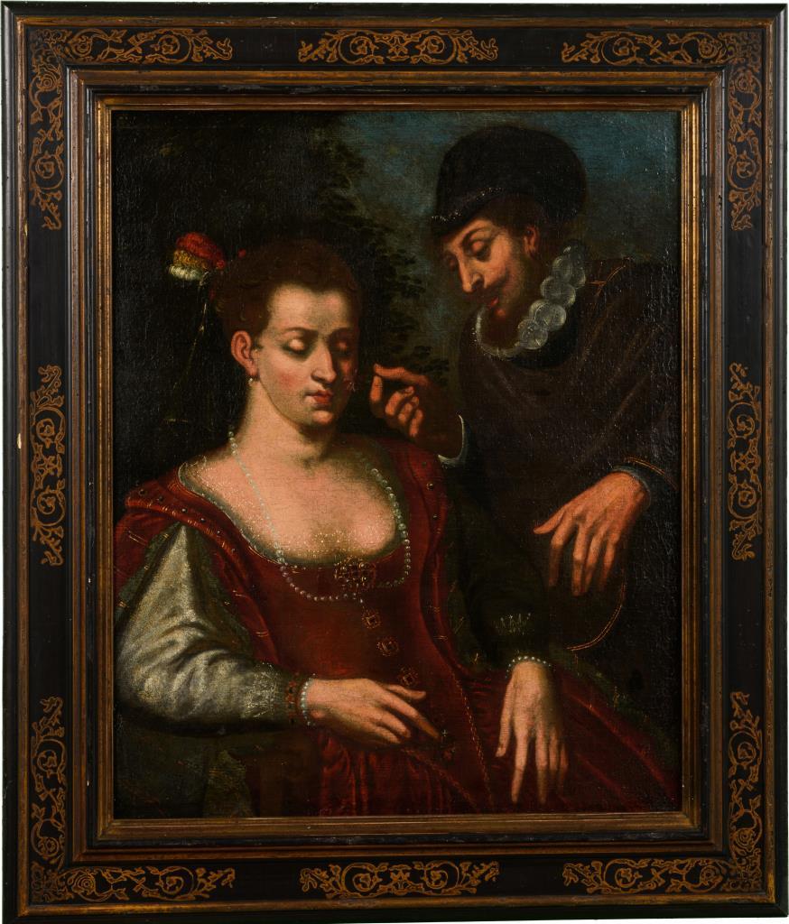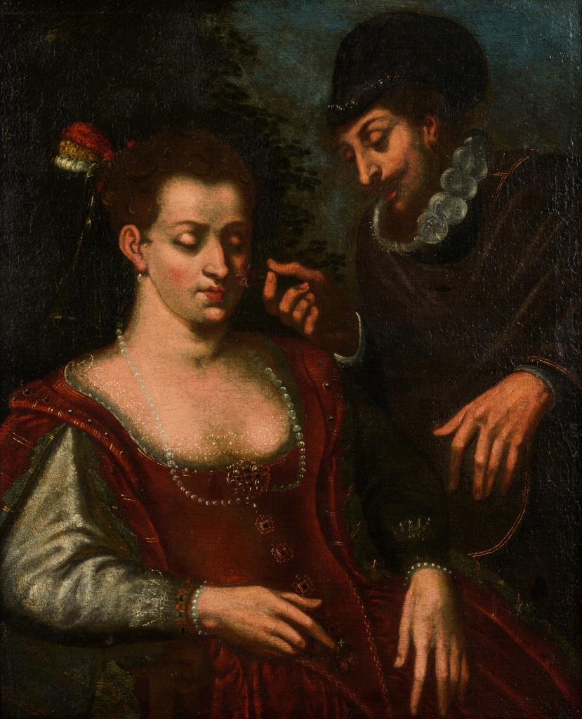 Szene mit Edelmann, der einer jungen Dame eine Blume unter die Nase hält. Leinwand doubliert.