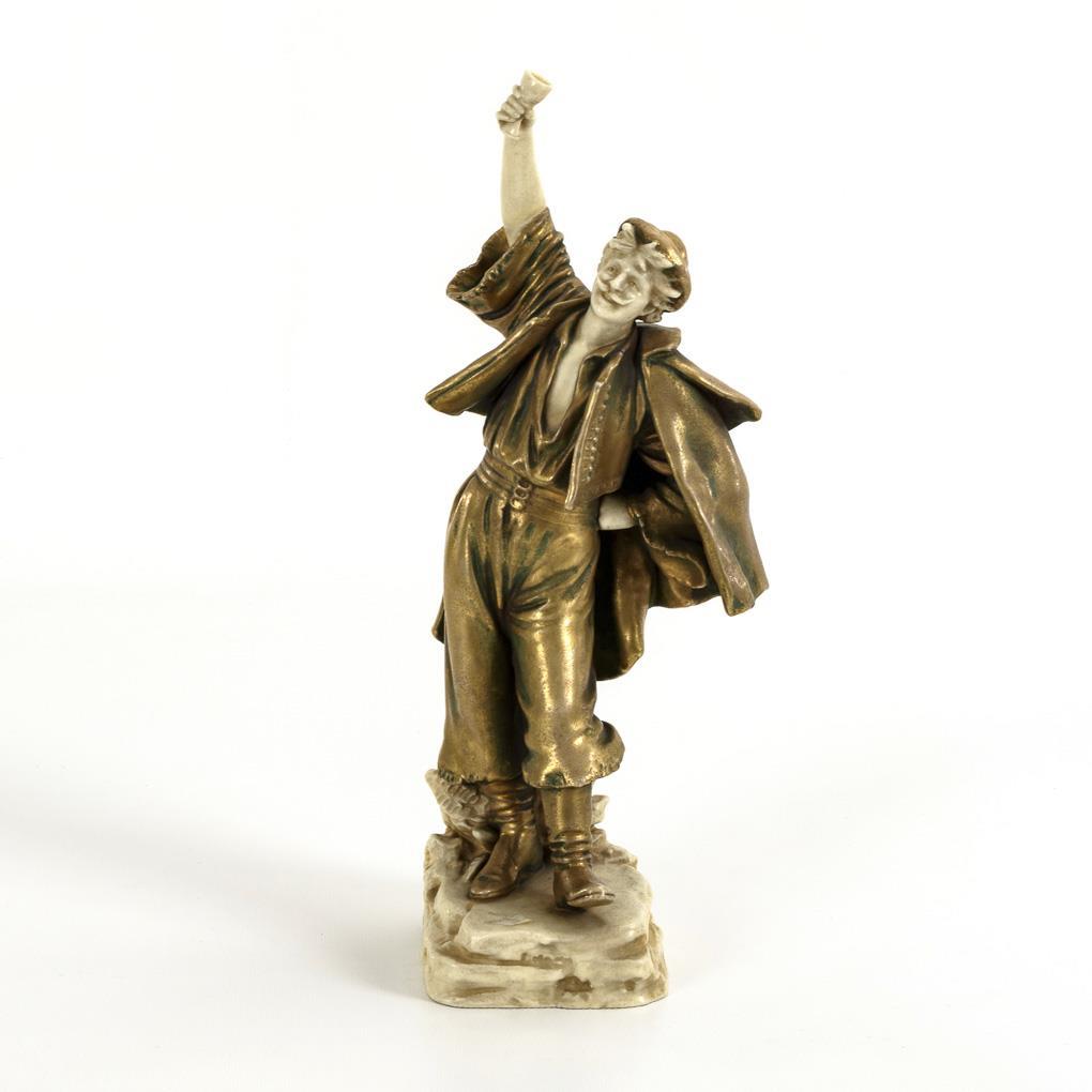 Standing man with joyful look and raised wine goblet, on natural base. Slightly rubbed.