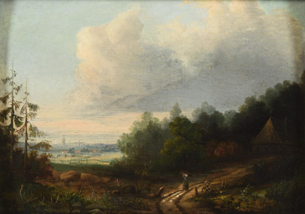 Picking brushwood near the farmhouse at the edge of the forest with view into the distant town under cloudy sky. Light traces of age.
