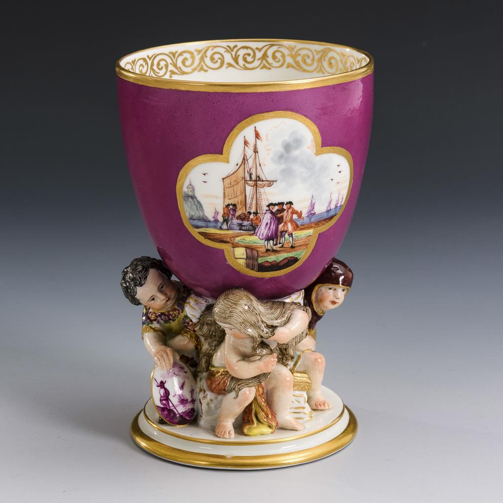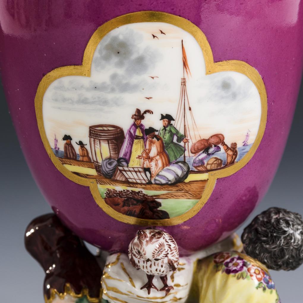 Group of putti designed as blacksmith with tongs and anvil and as miner with ass leather, pick and cupid's shield sitting on a round plinth, turning towards a putti lady combing her hair; on top a cupola with purple background and merchant ice scenes in two quatrefoil cartouches. Minimal gold abrasion on the inner rim.