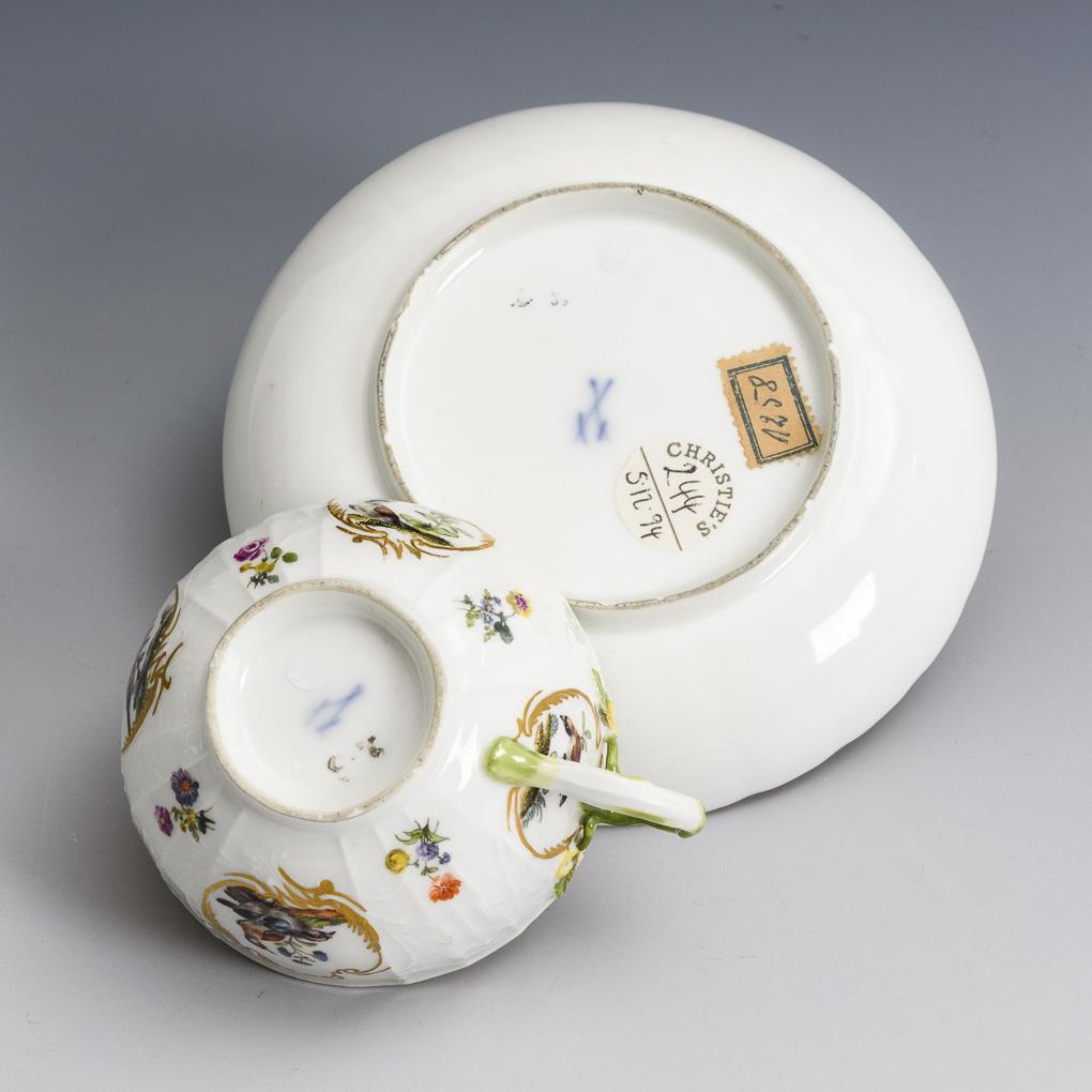 Mould "Dulong". Bellied cup with branch handle. In the gold-framed rocaille cartouches each depicting different birds.