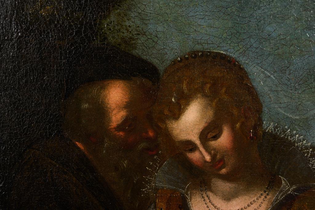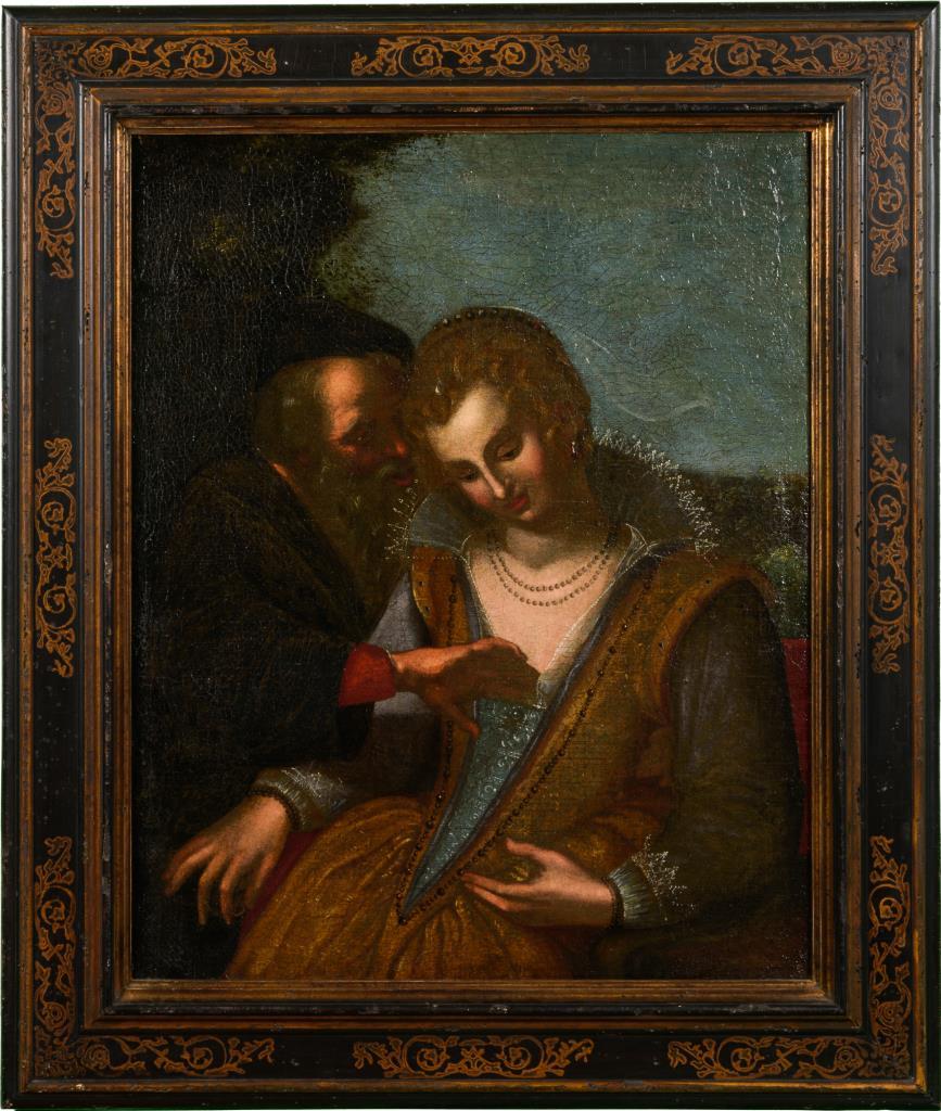 Szene mit älterem Mann, der eine junge Dame bedrängt. Leinwand doubliert.