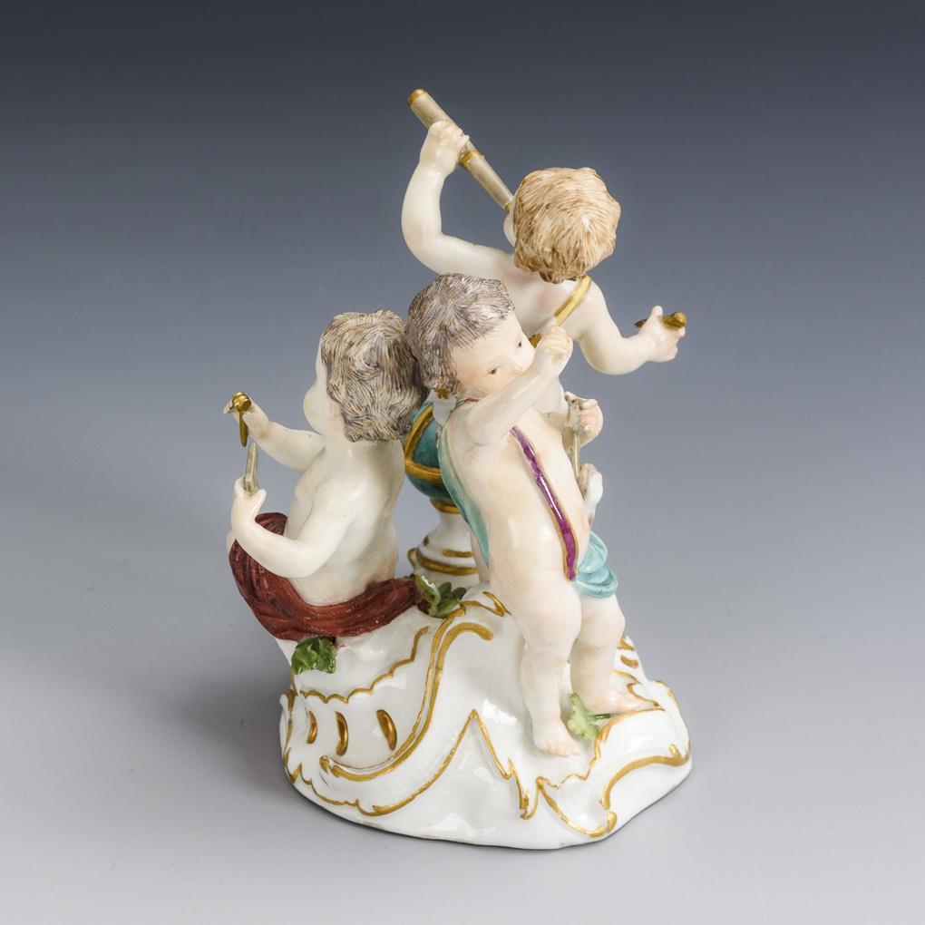 Three putti arranged on a rocaille base with astronomical devices. 1 arm, both angles, telescope, 1 compass and 1 leaf restored, 1 compass bumped.
