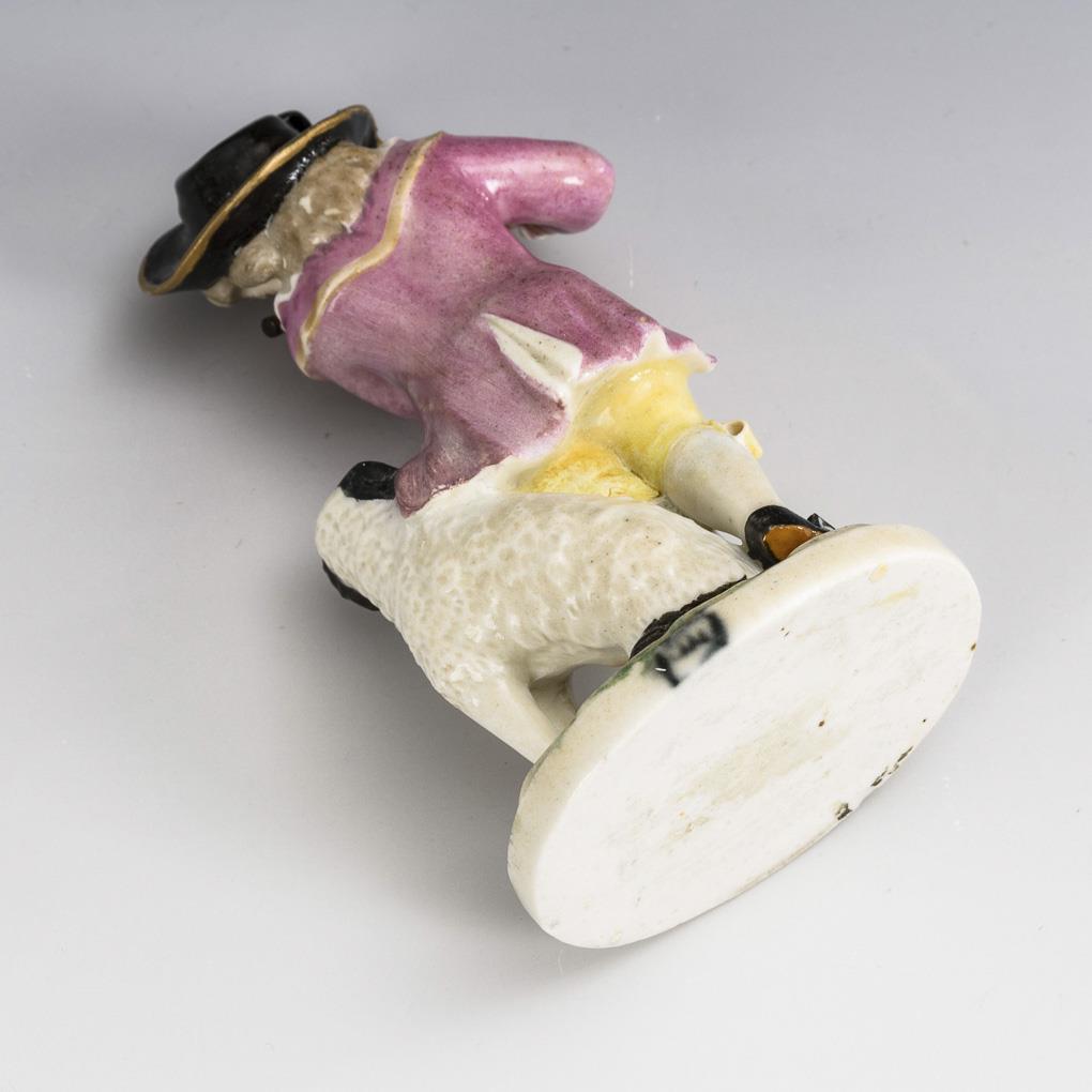 Boy standing by a dog, playing a transverse flute. Hat of the boy, transverse flute and both legs restored.
