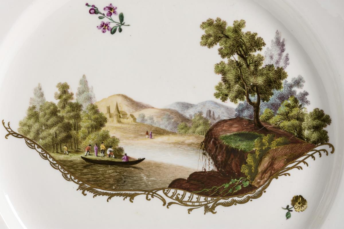 Credenza plate with multi-pass rim. In the mirror above a gold rocaille the finely painted depiction of a river landscape with architecture, boat and staffage.
