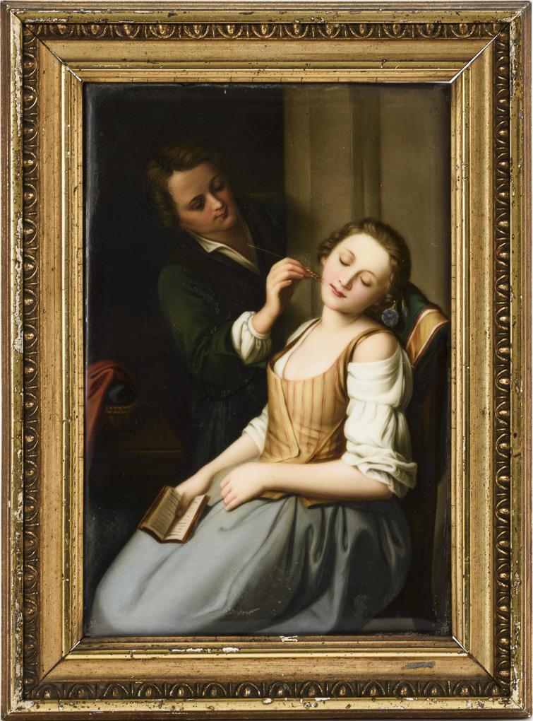 Rectangular plate depicting a sleeping young woman, as well as a young man tickling the lady with an ear of corn, probably after a painting by the Italian painter Pietro Antonio Rotari (1707-1762). Minimal scratches.