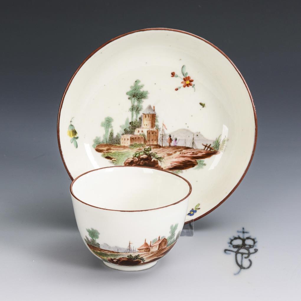 Bellied cup with ear handle. On the front as well as in the mirror of the saucer a landscape with architecture and people staffage. Saucer with ash approach.