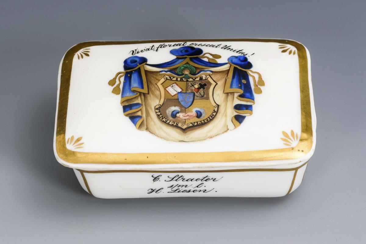 Rectangular box with rubbing surface inside the lid. On the lid a student coat of arms (Unitas Salia/Bonn?) with the inscription "Vivat floreat crescat Unitas!", on the body the dedication " C. Straeter s/m l. H. Liesen. / Münster 20/6 1863".