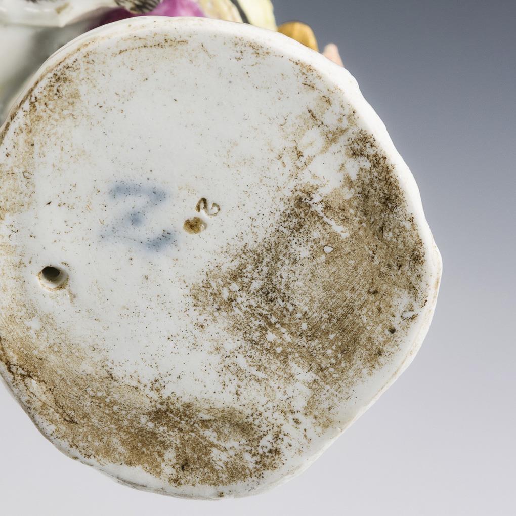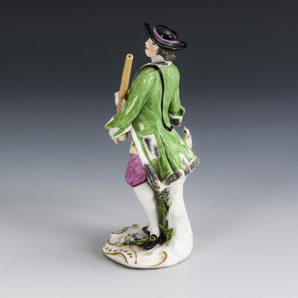 Hunter standing on a rocaille plinth with rifle and killed wild duck. Rifle barrel, 1 duck wing, duck head, hat, left hand and some leaves restored.